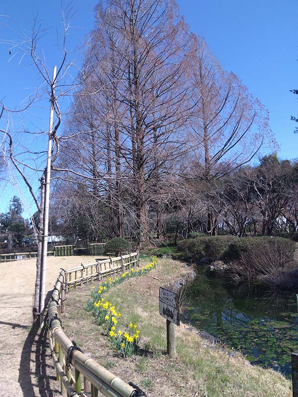 ふかや緑の王国 3月の風景 造園 2026.03.222026.03.23 池とメタセコイアとスイセンの黄色い花 梅の花 ハクレンの花 ツバキの赤い花 ジンチョウゲ(沈丁花)の甘い香りがします クリスマスローズ ペレニアルガーデン